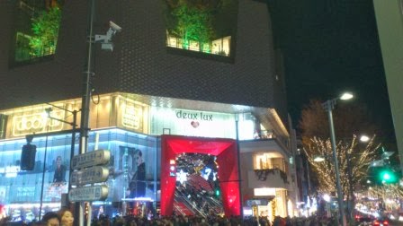 先到王子飯店下的百圓商店買點東西,新宿東口也算有一點點裝飾。由南口往西口走去,TERRACE City的入口有一整排漂亮的聖誕樹,不過後來查了一下,原來往內走去的サザンテラス小道,有相當漂亮的燈飾,可惜已經結束了。往前走一些,モザイク通也有整片如流星般的裝飾。